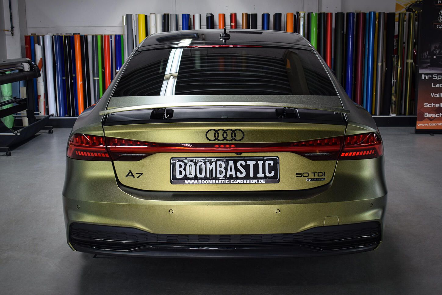 Fast furchteinflößend schön glitzert der Audi A 7 S Line, gleicht dabei einer Schlange, die im Dickicht des Regenwalds aufblitzt, gefährlich und anziehend zugleich. Gekleidet in Anaconda Gold, einer speziellen Farbkreation, die von uns persönlich entwickelt wurde. Aus der Fusion zweier Farbfolien entsteht zwischen Licht und Schatten ein ganz neues Spektrum: Je nach Lichteinfall und Bewegung wird Gold zu Grün, fließt Anthrazit in Schwarz. Diese exotische Farbe gehört zu den ganz seltenen Arten.