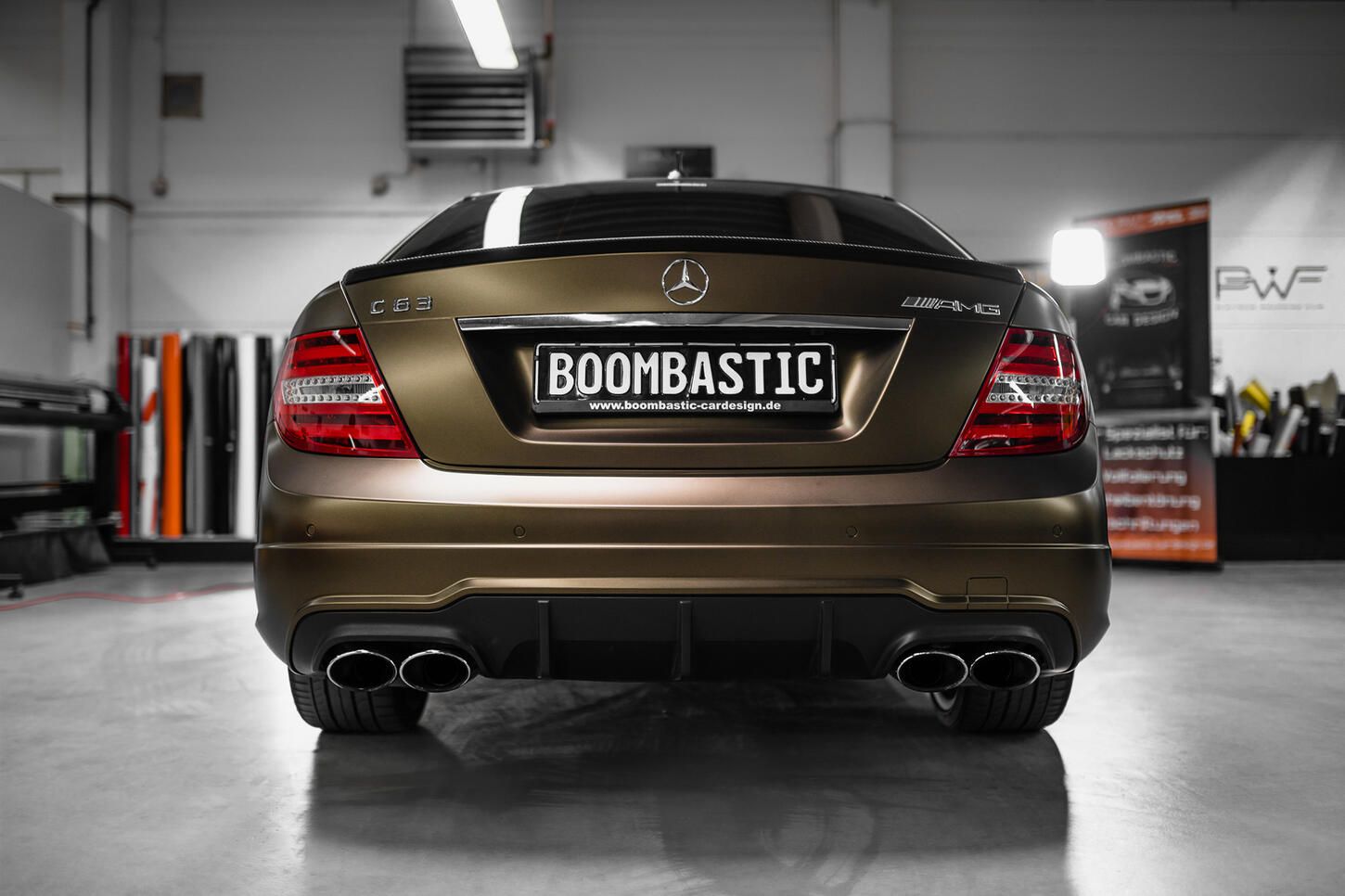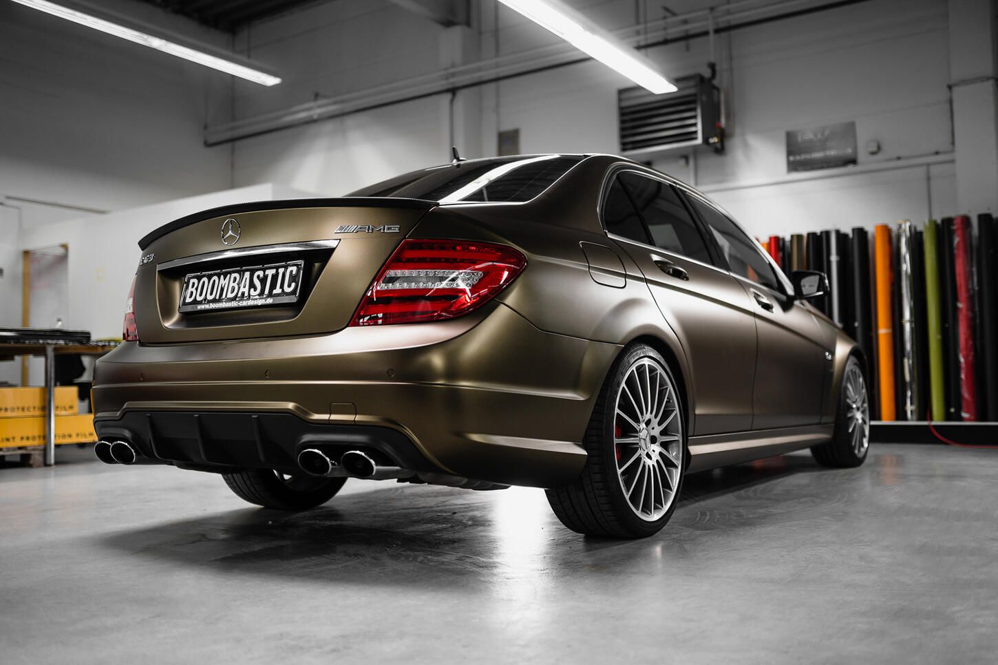 Der geschmeidig matte Goldglanz verwandelt jedes Auto in einen absoluten Hingucker, hier in Verbindung mit dem Mercedes-AMG C 63 wird das Ganze zum Gipfel der Eleganz.